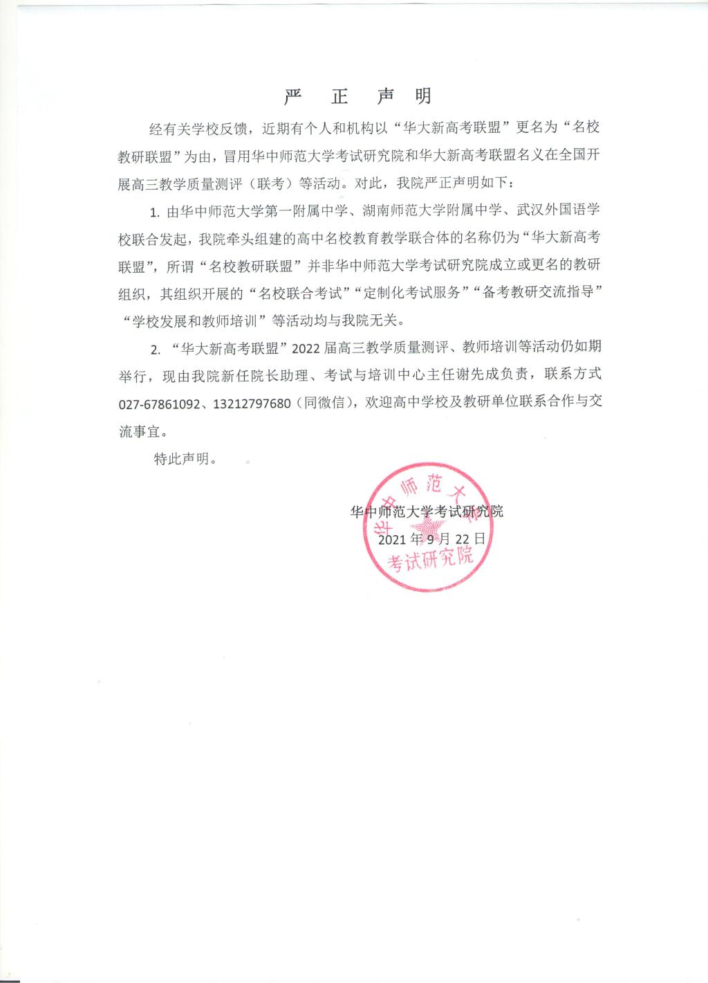 经有关学校反馈,近期有个人和机构以“华大新高考联盟”更名为“名校教研联盟”为由,冒用华中师范大学考试研究院和华大新高考联盟名义在全国开展高三教学质量测评(联考)等活动。对此,我院严正声明如下: