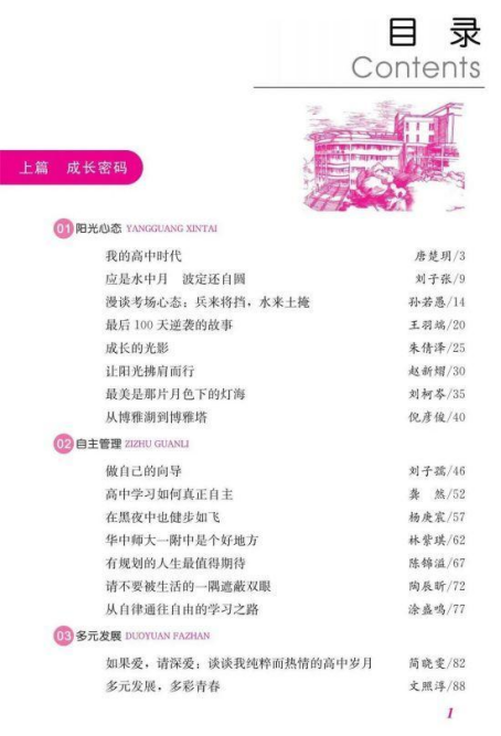 这本书展现了华中师大一附中学子的梦想、智慧与担当。高中岁月该如何度过?怎样才能让高中生活过得有价值而又有意义?对于本书中所呈现的我校学子的思考,我感慨良多。他们中有人深刻认识到人生需要规划,大规划能明确大方向,小规划可以获得高效率;有人感悟到坚持很重要,但有些时候也要学会选择,懂得放弃;有人觉得在高中学习的过程中要正确地认识自我,坚定地执行学习计划,但也要适时放松和休闲;他们中更有人提出,人不能成为“精致的利己主义者,而应当扛起责任,勇于担当,甘于奉献……由此可见,高中三年,从学业的进步到习惯、品格的养成,从人生理想的确立到人生价值的叩问,他们经历了ー段完整的青春成长旅程。
