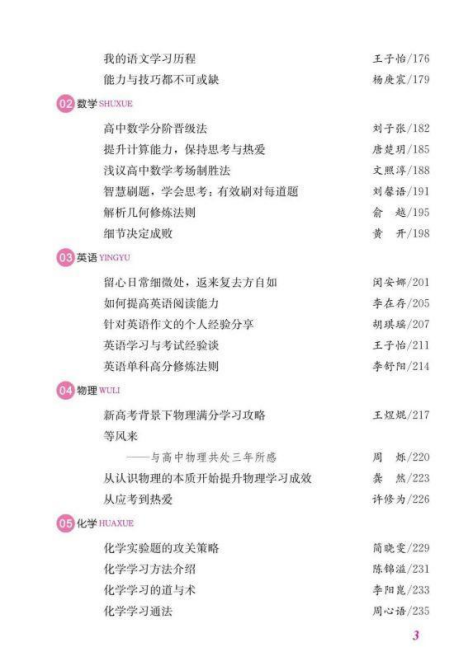 这本书里的很多内容都是学长学姐们在进入到大学之后,重新回望自己三年的高中生活所写下的一些真实的体验、成长经历以及学习方法。非常希望它能够在你感到迷茫、无助或者沮丧的时候,给你一些启发或者是前行的力量和勇气。